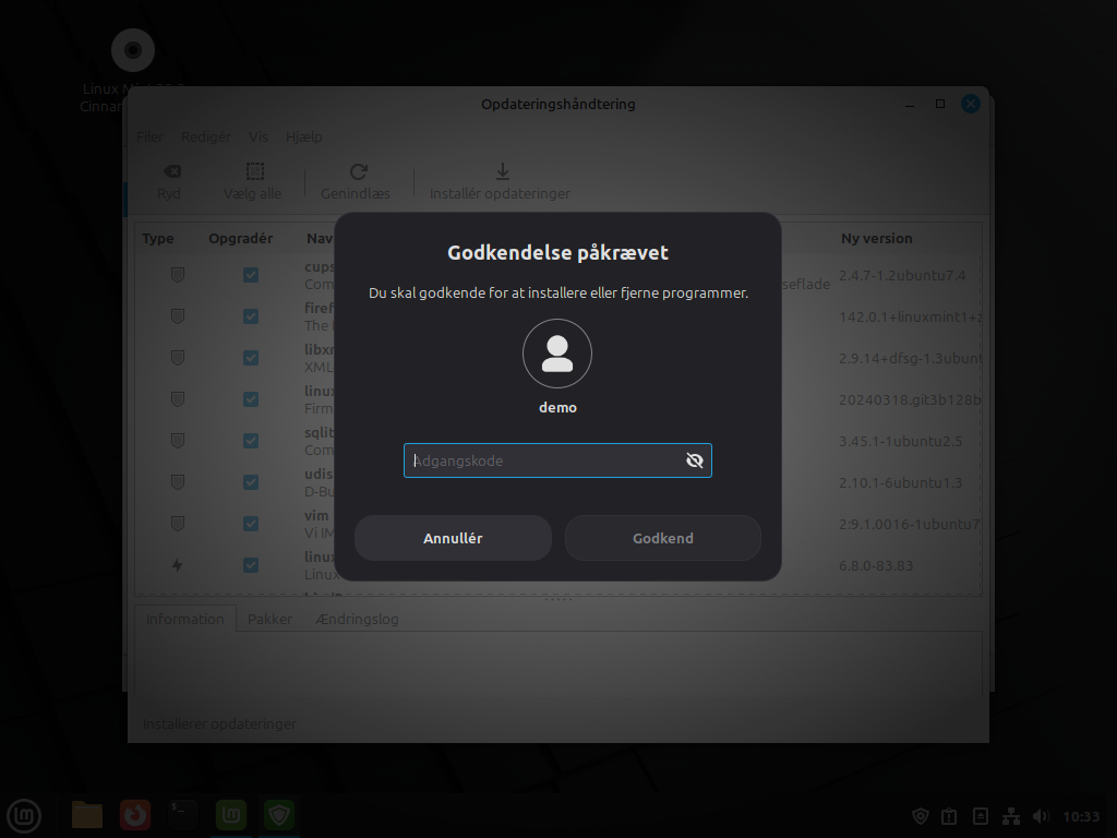 Helt generelt gælder det, når du er inde og lave indstillinger der har konsekvenser for måden din linux-computer fungerer på, at du bliver bedt om at skrive din adgangskode. Det er den kode, du oprettede da du installerede systemet.