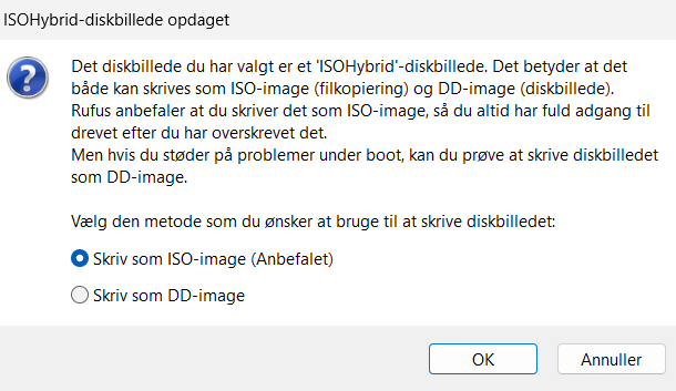 Vælg den anbefalede “Skriv som ISO-image” i dialogboksen der dukker op og tryk så OK.