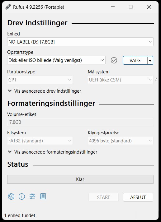 Under “Enhed” skal du lige sikre dig at det er din USB-nøgle der bliver fundet af Rufus. Det burde ske automatisk, men undersøg lige for en ordens skyld om antal GB passer med det du forventer fra din USB.