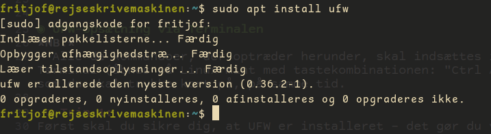 Først skal du sikre dig, at UFW er installeret - det gør du ved at kopiere teksten i feltet herunder og indsætte det i din Terminal, efter $-tegnet: